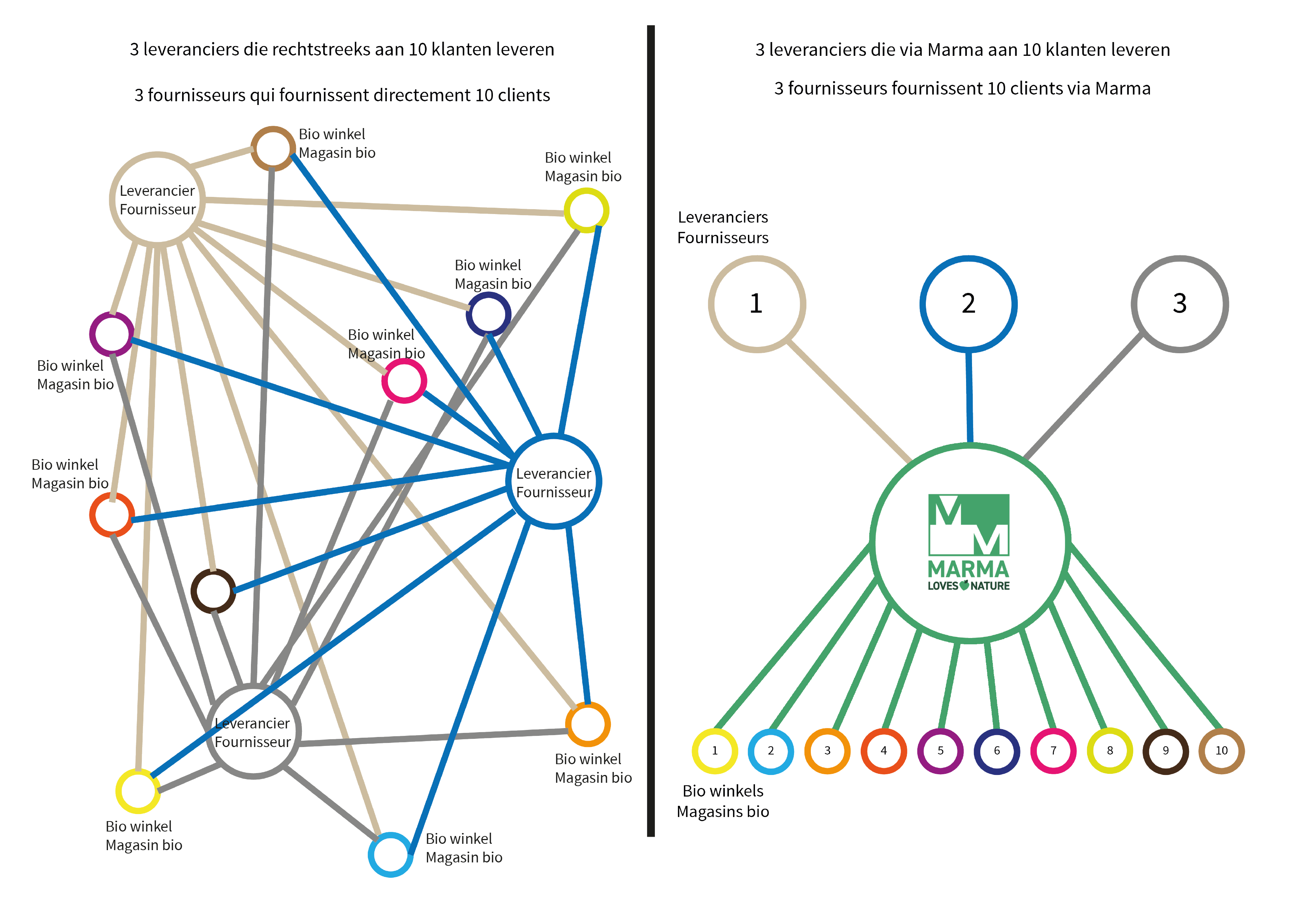 Eerst en vooral worden er door samen te werken met Marma heel wat kilometers bespaard die de leveranciers anders zouden maken door rechtstreeks naar alle klanten te leveren. Stel dat Marma 300 leveranciers en 1000 klanten heeft ten opzichte van 1 klant met 100 leveranciers, dan betekent dat 2300 leveringen door Marma per week ten opzichte van 150 000 leveringen per week indien de leveranciers rechtstreeks zouden leveren.